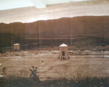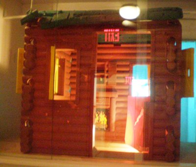 One of the other wooden structures is Burning House, a small cabin made to look as though it is on fire. The outside walls glow, while a video playing inside depicts an actual burning house (fire is a recurring motif throughout the show). The rustic house, protected by glass, is a replica of a Lincoln-era log cabin with a hearth.