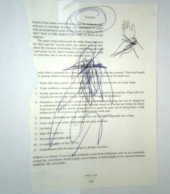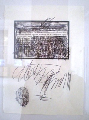Franco’s exhibit stretches from one end of the hallway to the other, spilling through three rooms and including sixteen titled works and a number of unnamed pieces. Texts torn from The Dangerous Book for Boys by Conn Iggulden have been manipulated by scratching and doodling, often featuring obscenities such as “Fuck Yes!,” which appears on a page dotted with skulls and stick figures.
