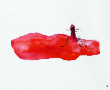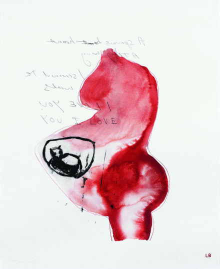 During the last two years of her life, feminist sculptor Louise Bourgeois (1911-2010) collaborated with the self-revealing YBA artist Tracey Emin on a series of prints entitled DO NOT ABANDON ME, published in an edition of 18 by Carolina Nitsch. Emin spoke of her friendship with the 98 year old artist in an interview with Kisa Lala in early 2010, stating: “I asked if I could meet her, and she said yes. Now we’re doing a collaboration. Louise makes watercolor prints and I do drawings over the top.” The prints use a new technique that transfers the dye from Bourgeois’ original gouache drawings onto fabric, to which Emin added text and drawings in black ink.