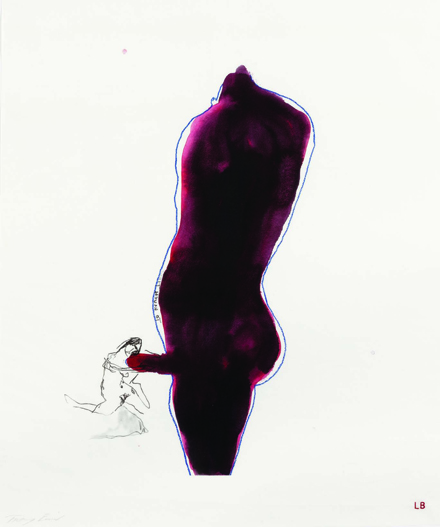 In many of the works, Emin plays with the scale of the gouache torsos by making her additional figures smaller, effectively transforming the body into a landscape; figures fit inside uteruses, and sit atop penises. Emin’s titles, such as I held your sperm and cried (2010), I wanted to love you more (2010) and When my cunt stopped living (2010), add narrative to the works that is at times violent, despairing, and hopeful, as well as autobiographical and all-encompasing. The texts have a range of voices: some are like diary entries, some are like streams of consciousness, and some are similar to poetic slogans. For example, in I just died at birth (2010), Emin fills the body with text that is part religious inquiry, part personal dialogue. The text literally fills the form of the body, metaphorically containing the personal. The title Just hanging (2010), depicting a female nude hanging herself from a penis, adds an element of dark humor to the work. The text threads together the 16 works into a narrative of despairing self-awareness and self-narration. As a whole, the series combines the abstract language of both artists, balancing generational attitudes towards feminism and the body.