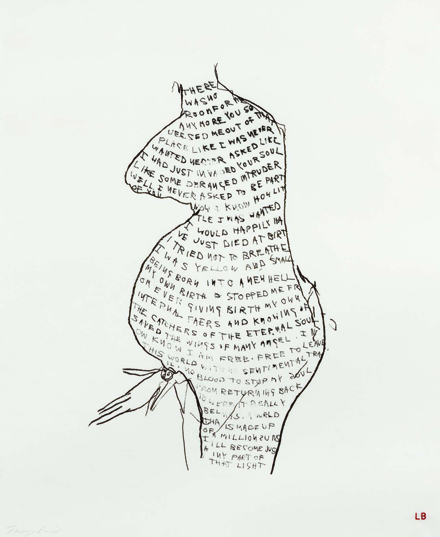The collaboration between Bourgeois, a first-generation feminist artist, and Emin, a second-generation feminist, shows a continuity between feminist themes, but also uncovers the differences in the means of expressing these very ideas. This can be seen in the way that Bourgeois’ abstracted torsos interact with Emin’s scrawling drawings and brutally-personal texts. The surface of the prints is significant, as both artists have worked with fabric–a medium that represents female labour–extensively. As Emin described, “We both work with recurring themes as well. Things that come again and again into our life, that don’t go away.” A major recurring theme shared by both artists is the female body as a site for both violence and creation as intersected by the sex act. Emin, famous for her work Everyone I have Ever Slept with 1963-1995 (1995), has made her career by opening her personal life to the public as inseparable from her artwork. Emin’s art confronts the viewer with autobiographical texts describing personal, very specific occurrences of her life to relate to the viewer’s own life-experiences. While Bourgeois’s works are similarly personal and psychological, they are more abstract in their visual language; thus both artists use their past in different manners.
