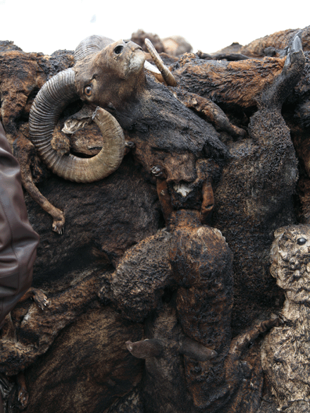 – Jacksons’s vision of the aftermath of the Hiroshima atomic-bomb attack, “August 6, 1945” in scorched, found, and painted wood sold for $125,000.