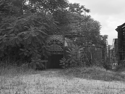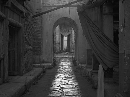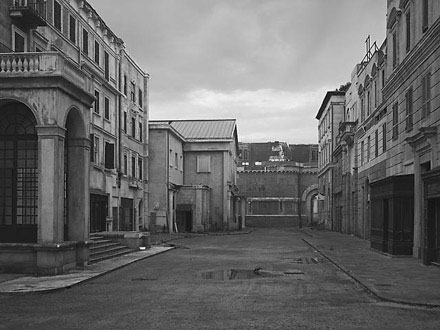 Fascinated by the ruins of Cinecittà , the legendary set of Fellini’s epic films, the artist maps out the ghostly landscape of this oft-dismissed area of Rome. The architectonic structures which have survived among the outdoor space of the studios form the main subject matter of this series of carefully balanced compositions; reminiscences of human intercessions, such as curtains and scaffolding, are framed by arches and mysterious gates. Contrasting the memory of a lively past with the vacancy of the present, the artist captures the site’s unique archeological identity.