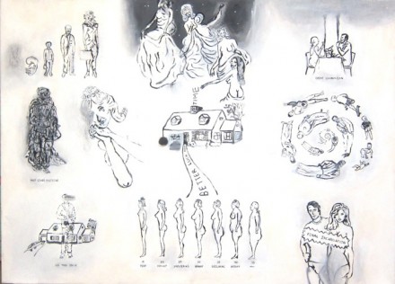 Williams’ newest work conveys an outwardly anti-war sentiment, as demonstrated in title chosen by Williams and Lowman for the show. “Al Qaeda is the CIA,” Williams’ eighth exhibition at 303 Gallery, is the most comprehensive gallery show for the artist to date. While Williams has always aimed to solicit confrontation with her work, she has historically explored many different themes and topics. Immediately following her move from Chicago to New York in 1981, she focused on her personal struggle with sexual and domestic abuse. Before meeting her husband, Williams was involved in a series of abusive relationships. As she described of this transitional moment, “coming out of it I was angry and wanting to share.” This moment coincided with a strong feminist presence in contemporary art, which Williams also addresses in her work of this period. Her ability to generate visual commentary that is both light-hearted and cynical yields an honest and personal expression of gender politics and social awareness. Her 1989 painting, Better Luck Next Time, represents the progression of the female body in a harsh and confrontational manner.
