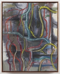 The works on view vary significantly in scale. Kuitca explored different sizes to express the dramatic change in display spaces in the last few years. The 2007 series that inspired this work was a group of abstract, melancholic representations of world-renowned theaters and opera houses during periods of demise. While the structures in these paintings varied, the mood remains consistent. In his more recent work, Kuitca’s paintings are increasingly energetic, combining certain compositional motifs that he has explored in the past with his familiar abstract technique. In some pieces the artist also incorporates collage. As one moves upward in the gallery space, the paintings posses a brighter palette and a less controlled brushwork.