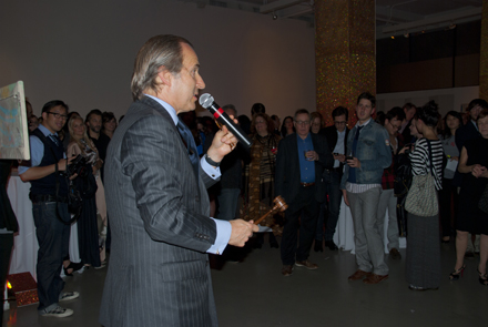Simone de Pury gets down to close a bid from Jen Brill, Kaws and others fill the crowd. All photos by Caroline Claisse for Art Observed.