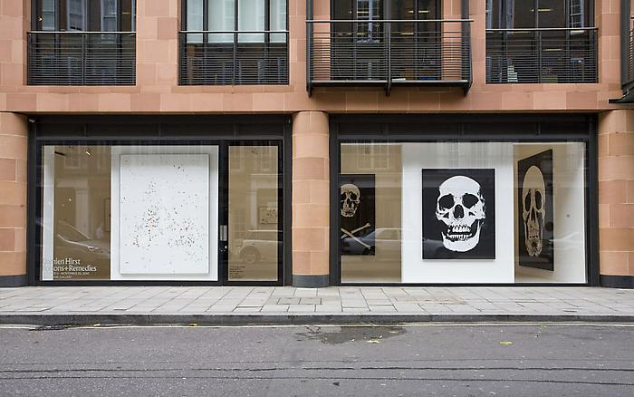 Currently on view at the Gagosian Gallery (Davies Street) in London is “Poisons + Remedies:” an exhibition of new paintings by Damien Hirst, in which the artist explores the opposition between life and death through binaries of color and scale. In these works, Hirst expands upon his now-iconic use of the skull, represented starkly here in black and white, contrasting it with colorful, detailed images of scattered pills, which also reflect his ongoing interest in pharmacological motifs.