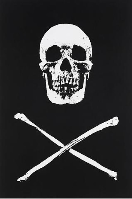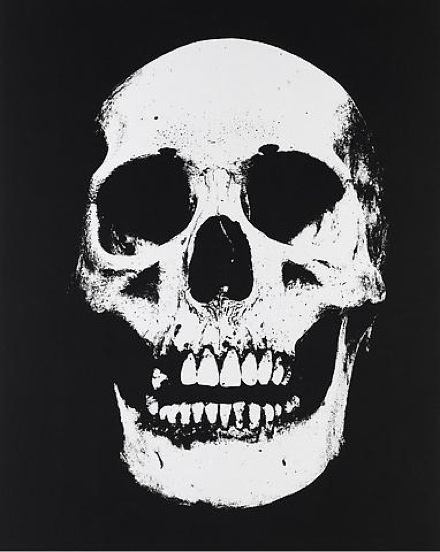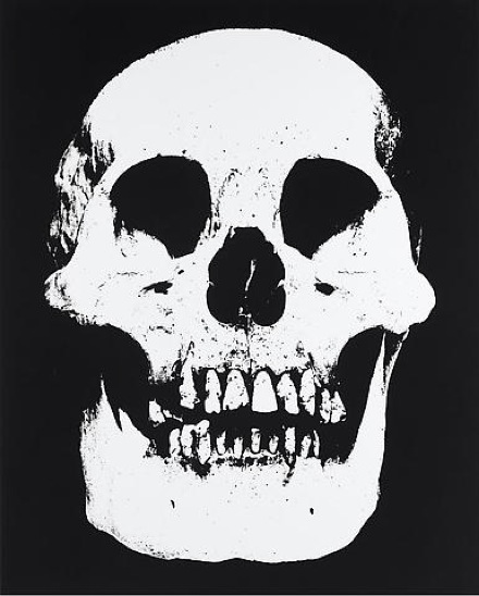 In Poisons, Hirst portrays magnified, individualized images of human skulls, rendered through silkscreen in black UV ink with charcoal onto large canvases. Each work is titled after a toxic chemical preparation such as Botulinum or Thallium, thus confusing the identity of the skull with the possible causes of its body’s death.