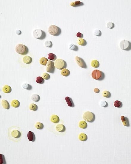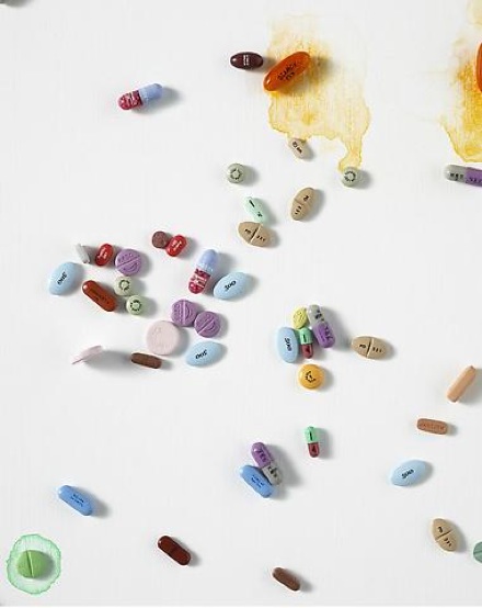The works in Remedies depict colored resin and plaster pills strewn across a painted white surface. In These Days (2008- 2009) and From Safety to Where (2008-2009), Hirst applies touches of watercolor in a gesture of medically-branded realism. “When you look at pills, they look so perfect, so pure. It’s hard to believe that each one comes with a list of side effects as long as your arm,” says the artist. “Pharmaceutical pills might be deceiving; they have the power to cure and to make sick.”