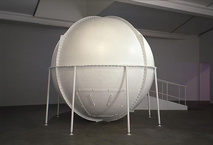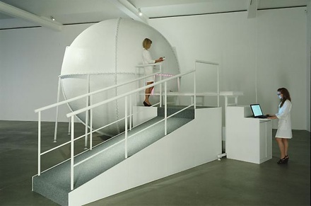 Visitors can further examine the relationship between interior and exterior light through the new work Bindu Shards (2010). The work is part of the ongoing Perpetual Cells series, where each cell stimulates an experience in which there is no object of perception; in other words, the light which is presented is light not seen. This in turn produces the “Purkinje Effect,” which is perceived uniquely during the transition from light to dark. Visitors enter Bindu Shards one at time and remain inside the sphere for twenty minutes. It takes the viewer between eight and twelve minutes for their eyes to adapt to the darkness. After this time “in front” and “back of the eyes” seeing is eliminated and the irises fully open.