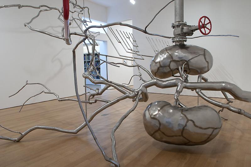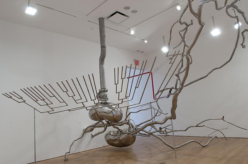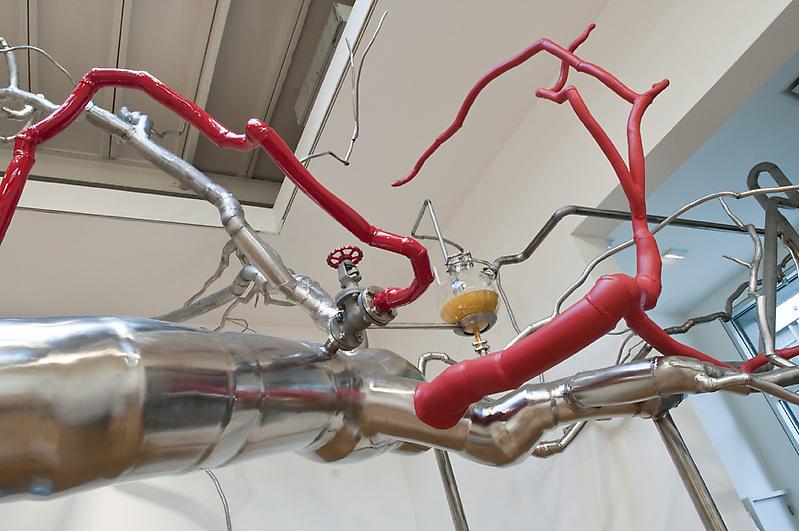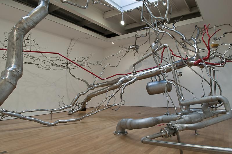 The intersection of the organic and the inorganic has long been a theme for the artist. Issues of controlling nature through mechanical apparatuses play out in his sculptures, as well as in his early works, which consist of machines that are programmed to squirt paint at predetermined times on various surfaces. The early pieces touch upon the natural process of creativity, mediated by the artificial. The earlier works in the series were installed outside, giving a direct, contrasting connection to the forms used within the works to nature itself. Distillation is seen inside the gallery space which helps to push the organic visual links inward, inside the body, as well as retaining references to tree branches. This movement inward as well as outward conflates a microcosmic and macrocosmic outlook, all while retaining the very regular, normal, features of steel piping.