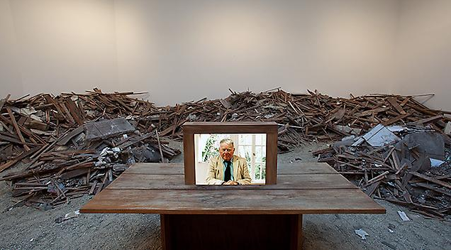Regen Projects is currently exhibiting Doug Aitken’s recent work: House.  The work is both fiction and narrative—a duality that exists in much of his work.  The video of his parents sitting calmly face to face as their home is demolished around them and its surrounding installation of debris provides a dramatized element to an event that actually occurred in Aitken’s life.