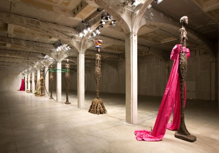 Referencing both the theatrics of a fashion show and the ultra-thin models in the industry, the lithe figures drip with designer clothes in surreal proportions, their outfits changing twice throughout the exhibition.