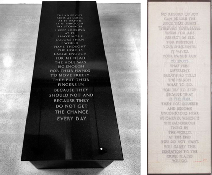 L: Jenny Holzer, Laments: The new disease came…, 1989. Nubian black granite. R: Jenny Holzer, Laments: No record of joy, 1989. Carbon on tracing paper.