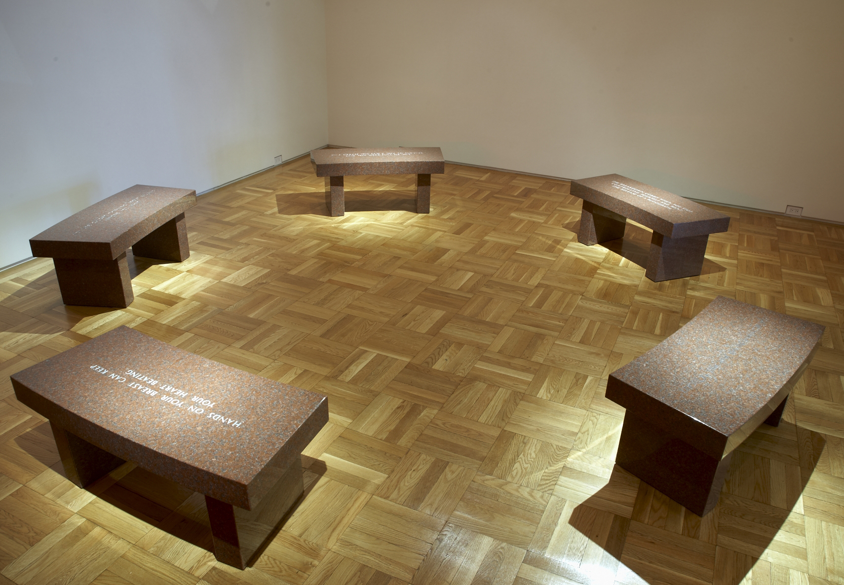 Jenny Holzer, Survival: The beginning of the war…, 1989. Indian red granite.
