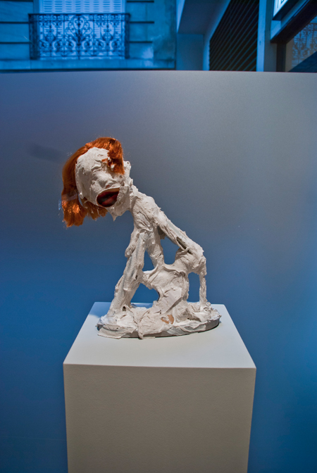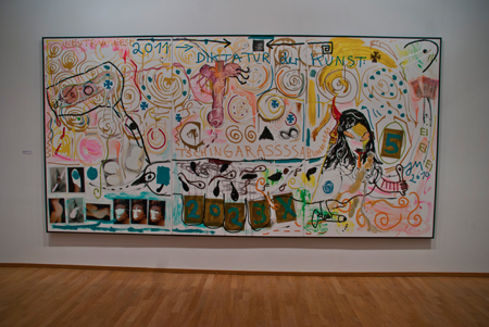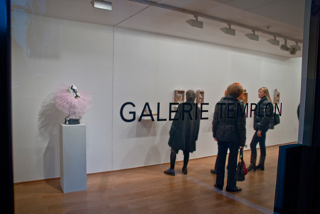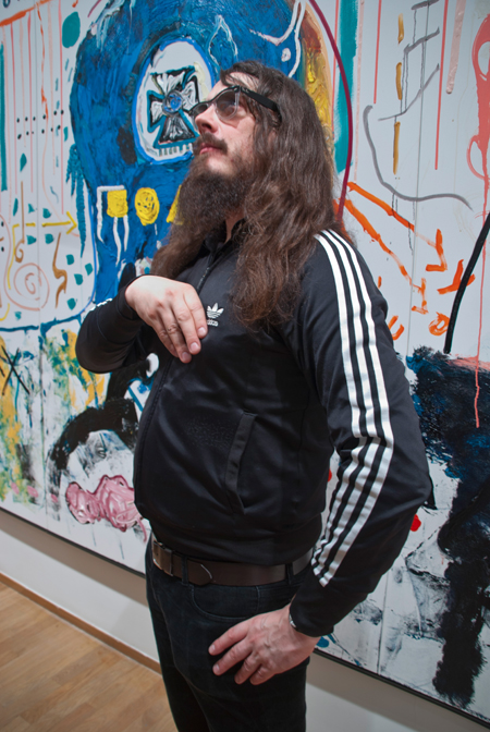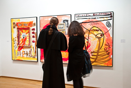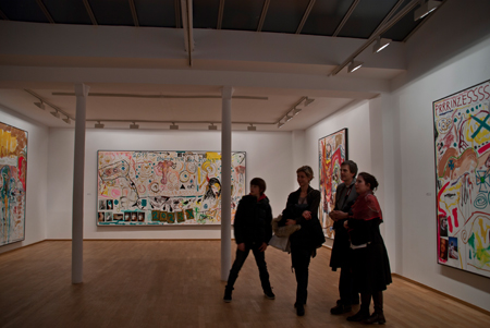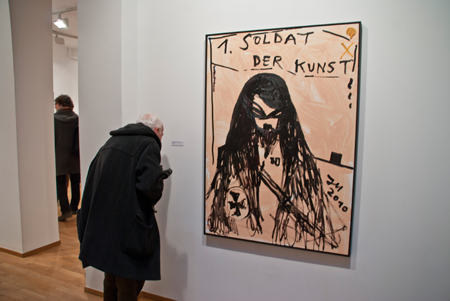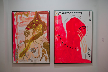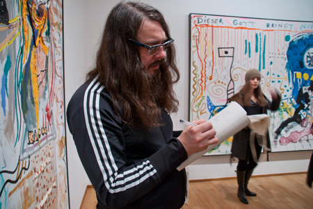 Art Observed was on site to meet German artist Jonathan Meese for his opening reception at the Daniel Templon Gallery in Paris. Renowned for his unconventional and at times rebellious behavior in the Berlin art scene, the St. Neutralité exhibition marks the first opening for the artist after a two-year hiatus from gallery shows. Now 40, Meese returns filling two venues of the gallery—the Rue Beaubourg exhibits the artist’s recent paintings, and the Impasse Beaubourg houses an installation of new and old sculptures. Citing Paris as the “City of Love,” Meese chose it as the debut home for his new “lighter,” more humorous works.