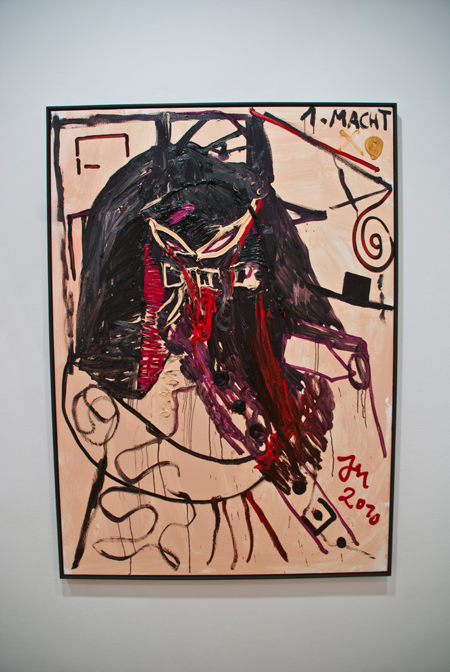 Jonathan Meese was born in 1971 in Toyko and lived in both Berlin and Hamburg before taking up permanent residence in the capital. His energetic and vibrant work is influenced from images sourced from Stanley Kubrick, Richard Wagner, and Marquis de Sade, as well as Twentieth-century artists Picasso and Matisse. The figures he has appropriated have led him to develop his own distinct mythology. Since 2004 he has devoted himself more toward performance, with notable works such as Noël Coward is Back, taking place at the Tate Modern in 2006, and his Improvisation on Wagner’s Parsifal at the Berlin Staatsoper in 2005. His work has been exhibited throughout the world at major museums and private galleries.