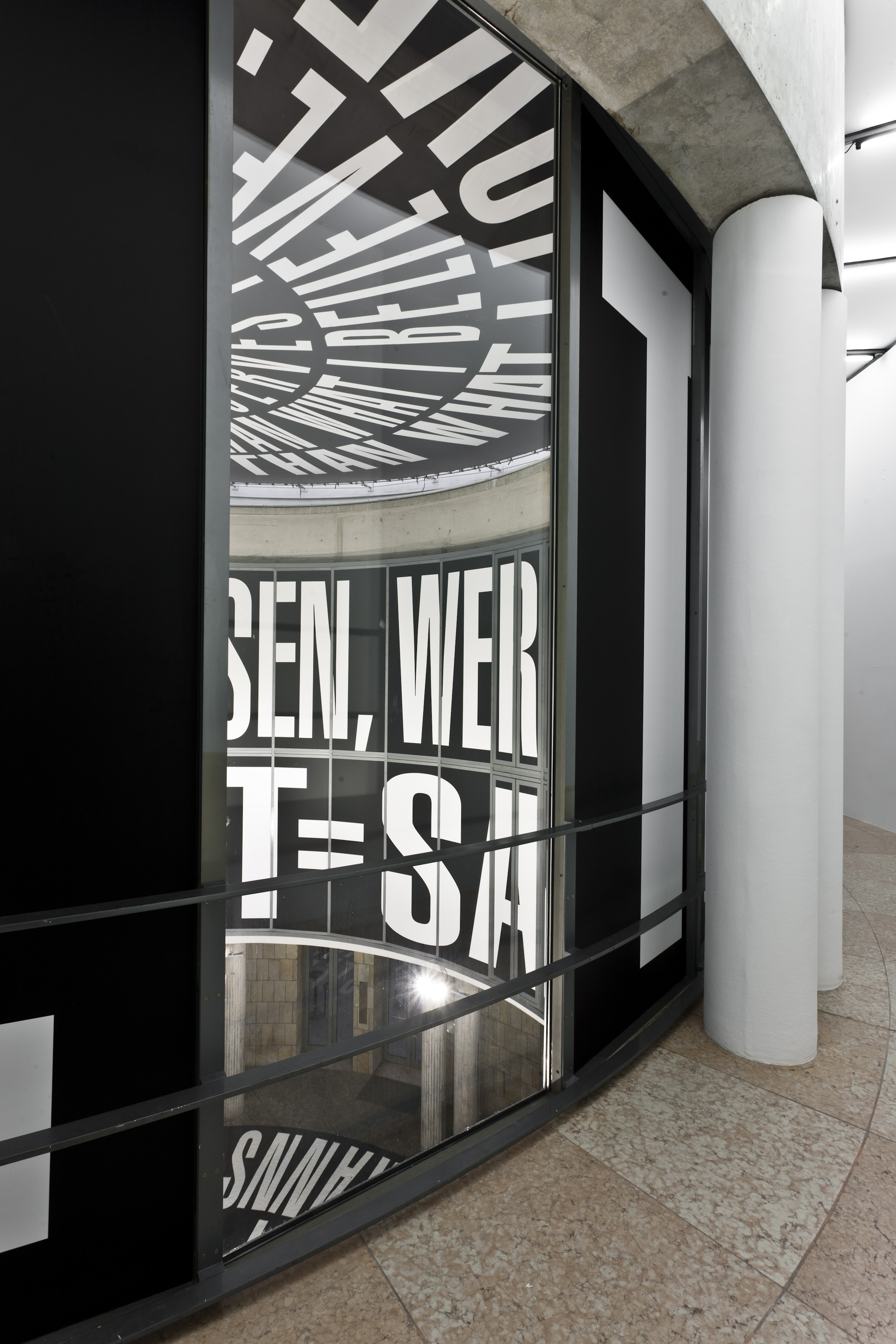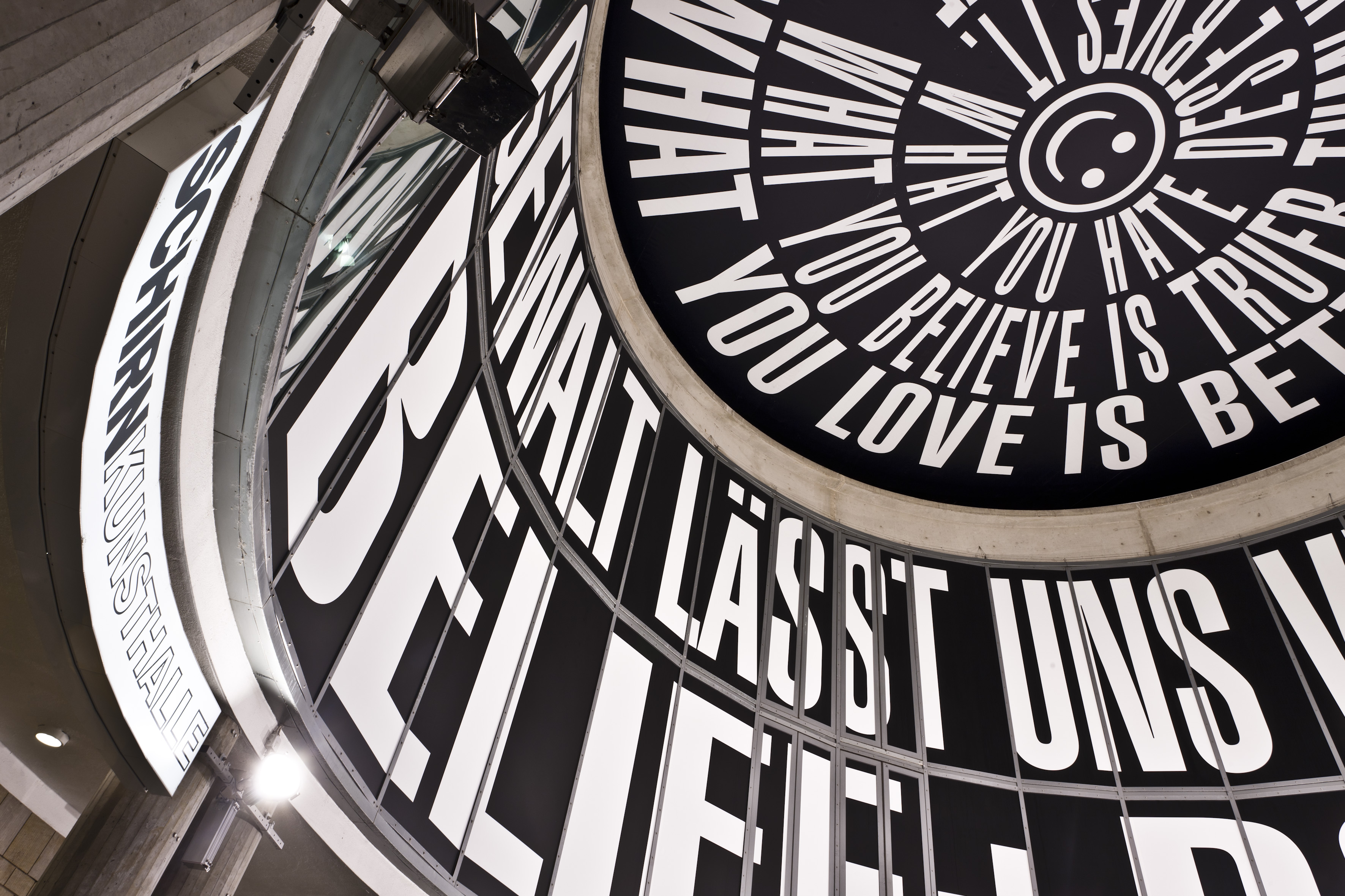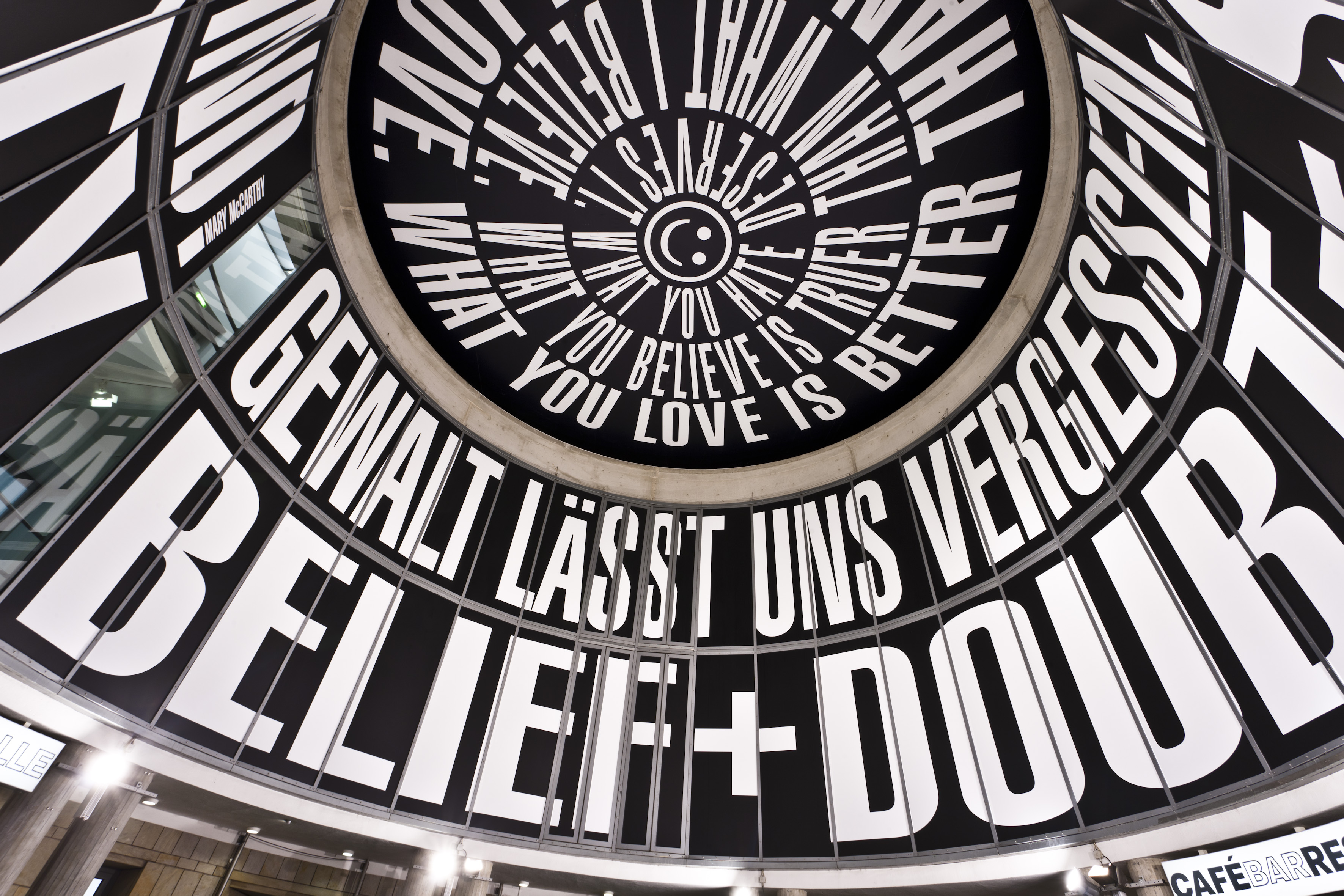 Kruger often chooses to exhibit her work publicly as a means of diffusing her political ideology, thematizing gender relations, consumer culture, and control. Curator Ingrid Pfeiffer asserts that her monumental text lends a graphic quality to the characters, effectively creating image from language. The installation text is presented in both English and German, with phrases such as: “BELIEF + DOUBT = SANITY,” and, “DU BIST VERLIEBT. DU KANNST EINFACH NICHT AUFHÖREN ZU LÄCHELN. DEIN HERZ HÜPFT. DU LÄUFST DAVON. (YOU ARE IN LOVE. YOU SIMPLY CANNOT STOP SMILING. YOUR HEART LEAPS FOR JOY. YOU RUN AWAY.)”