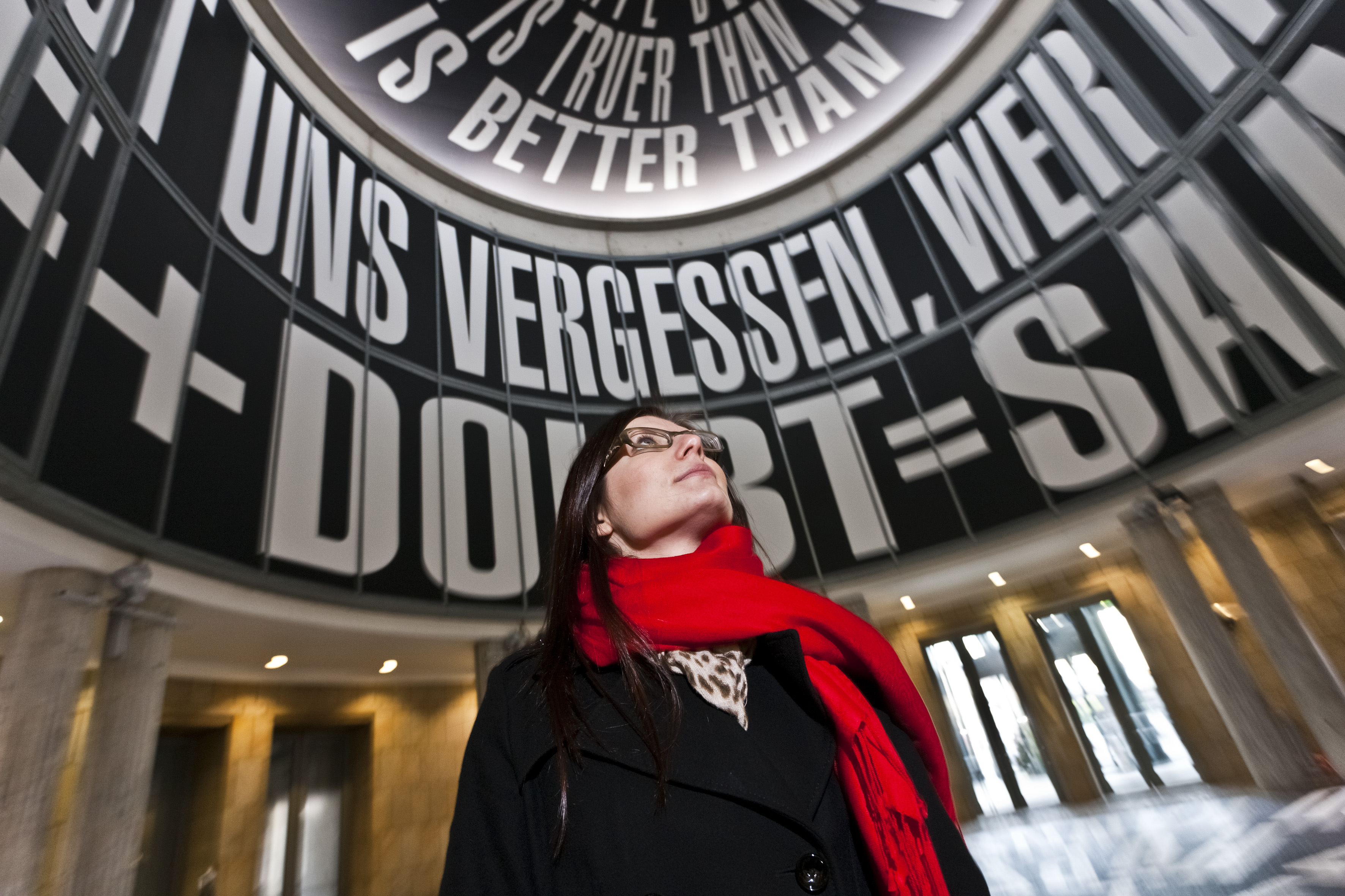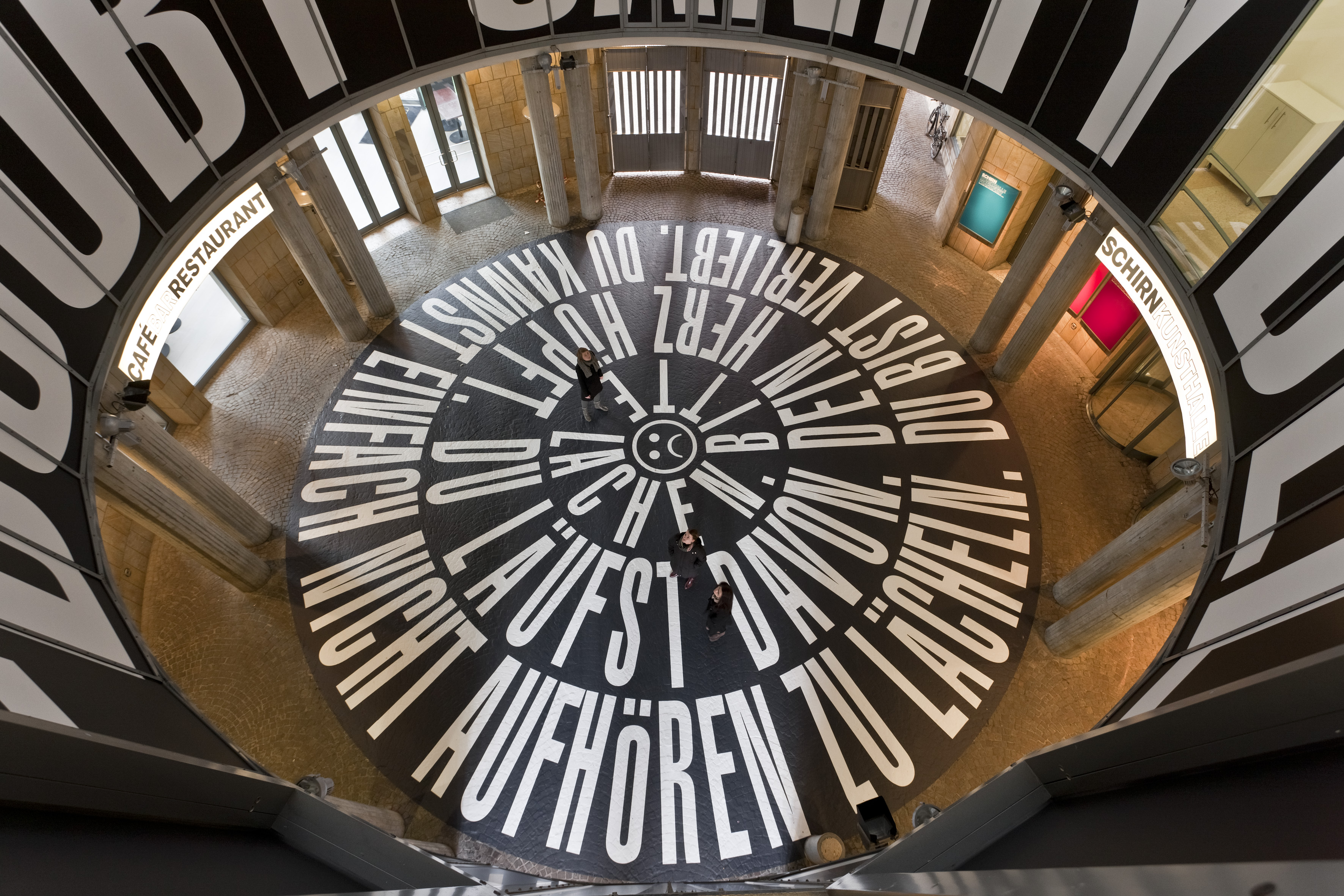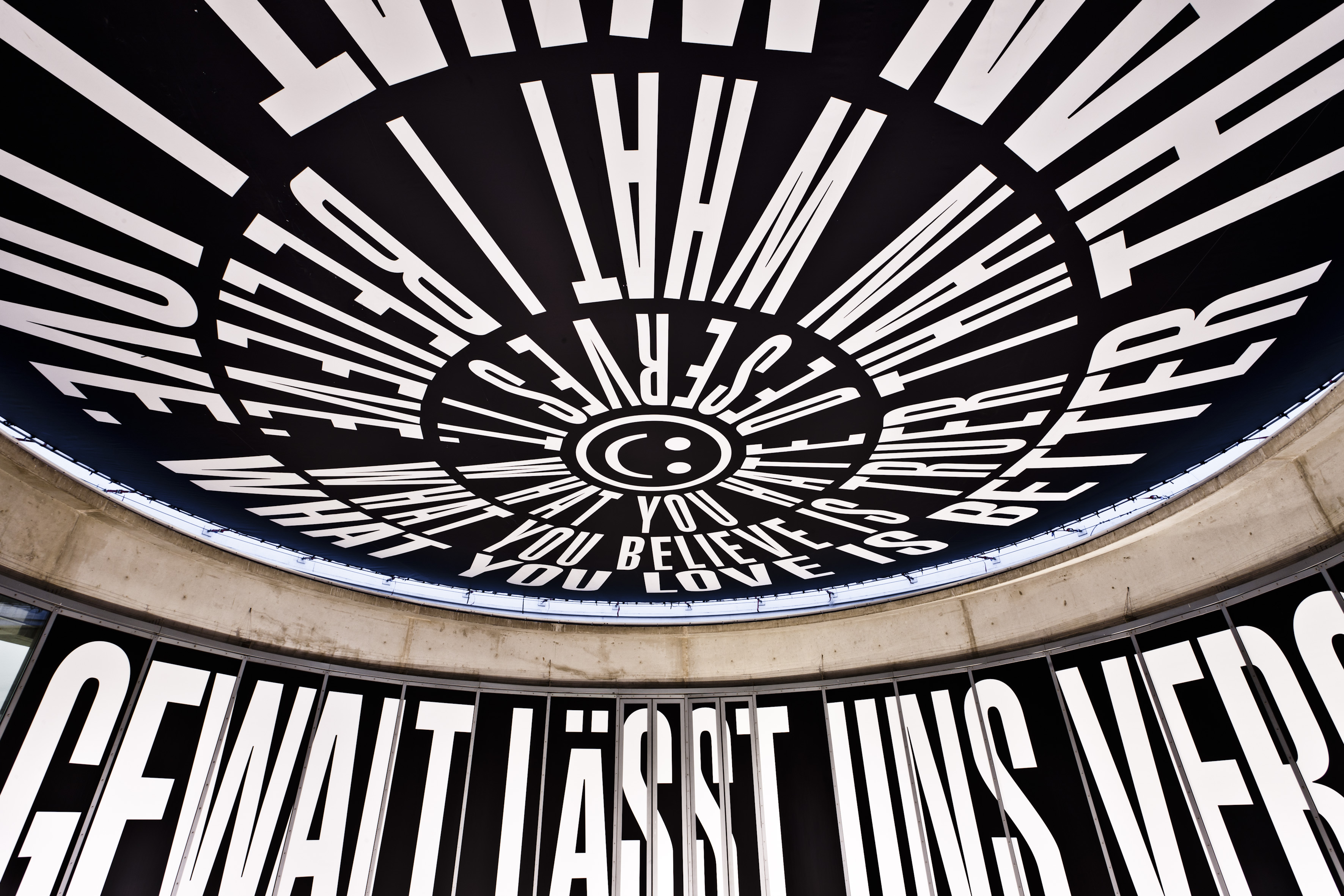 Kruger often chooses to exhibit her work publicly as a means of diffusing her political ideology, thematizing gender relations, consumer culture, and control. Curator Ingrid Pfeiffer asserts that her monumental text lends a graphic quality to the characters, effectively creating image from language. The installation text is presented in both English and German, with phrases such as: “BELIEF + DOUBT = SANITY,” and, “DU BIST VERLIEBT. DU KANNST EINFACH NICHT AUFHÖREN ZU LÄCHELN. DEIN HERZ HÜPFT. DU LÄUFST DAVON. (YOU ARE IN LOVE. YOU SIMPLY CANNOT STOP SMILING. YOUR HEART LEAPS FOR JOY. YOU RUN AWAY.)”