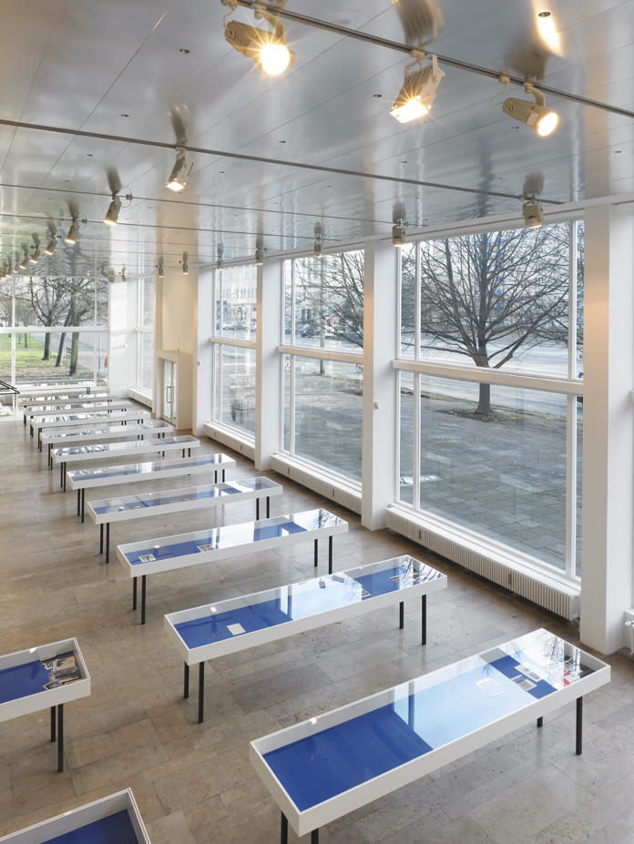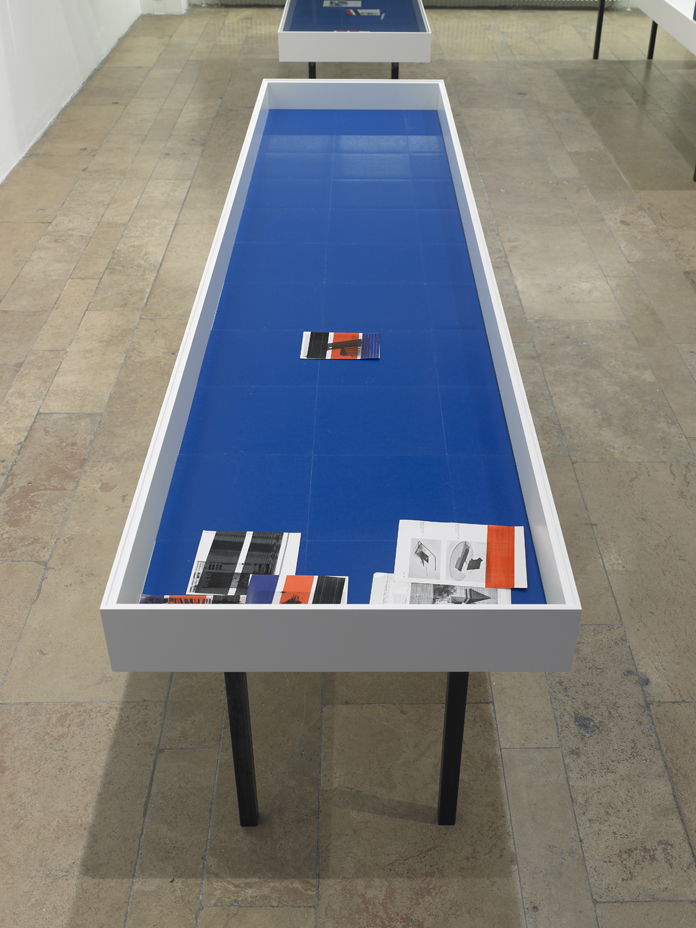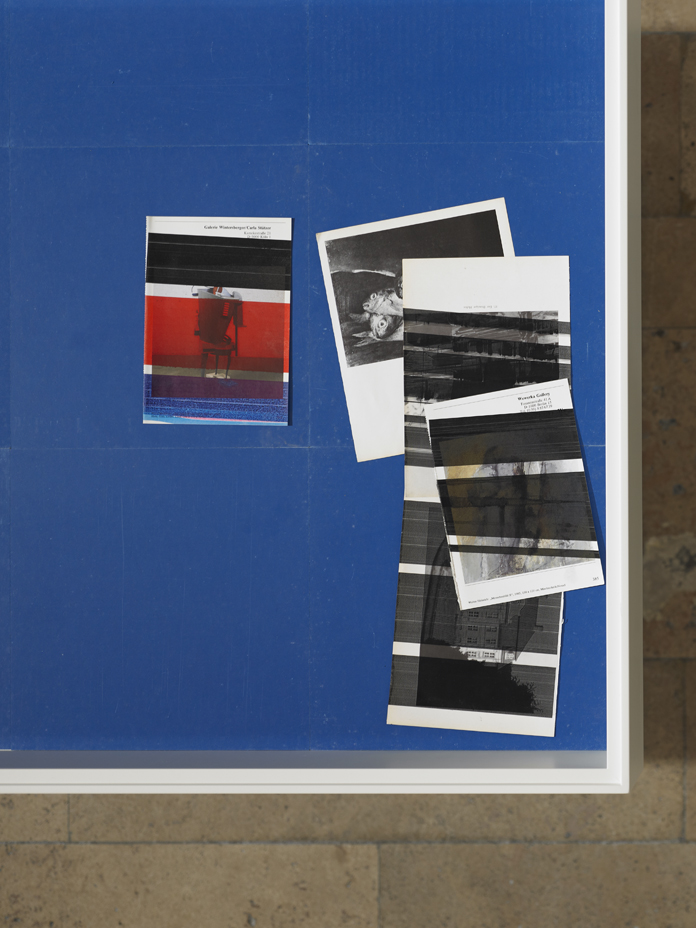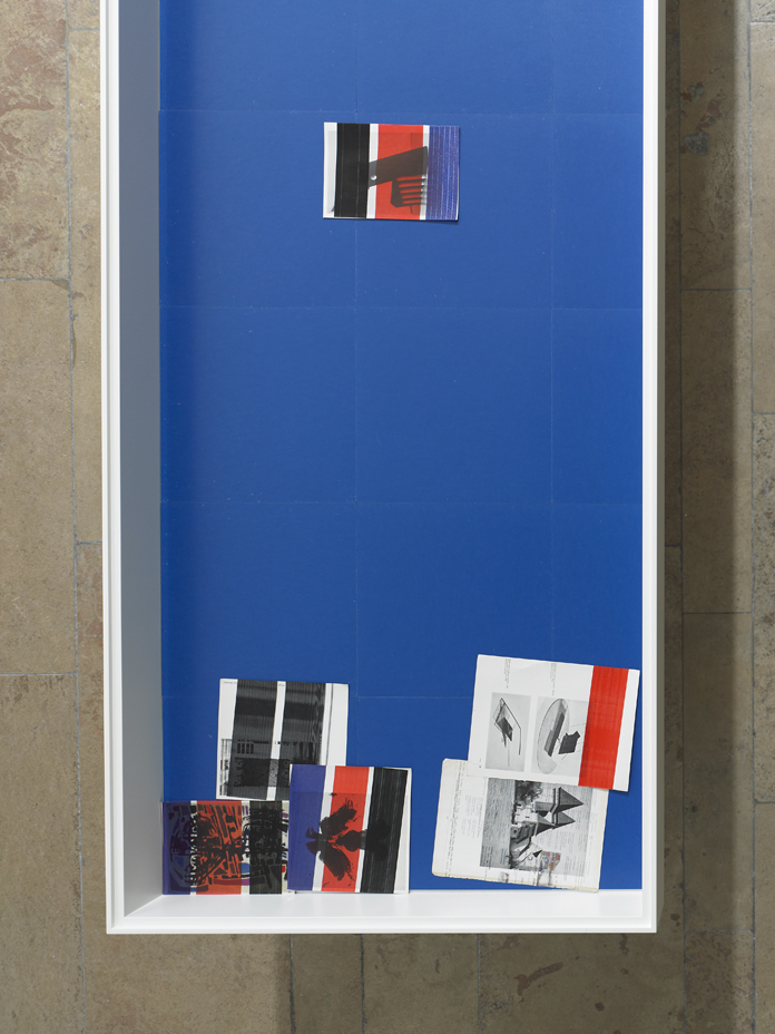 The papers began as pages from magazines and books that Guyton scavenged and then altered.  He then re-printed the pages overlaying the initial image with marks or “drawings” created by the artist on Microsoft Word.  Any errors made were duly accepted, as in moments when Guyton accidentally hit “print” on the wrong screen—the home pages of Apple or the NY Times pop up repeatedly among the hybrid printed pages.  Each vitrine is lined with blue vinyl floor tiles—the same as those in his kitchen—providing a striking background for the printed pages.  The papers are arranged in casual groupings, formal line-ups, or isolated vignettes, some vitrines holding only blue tiles.
