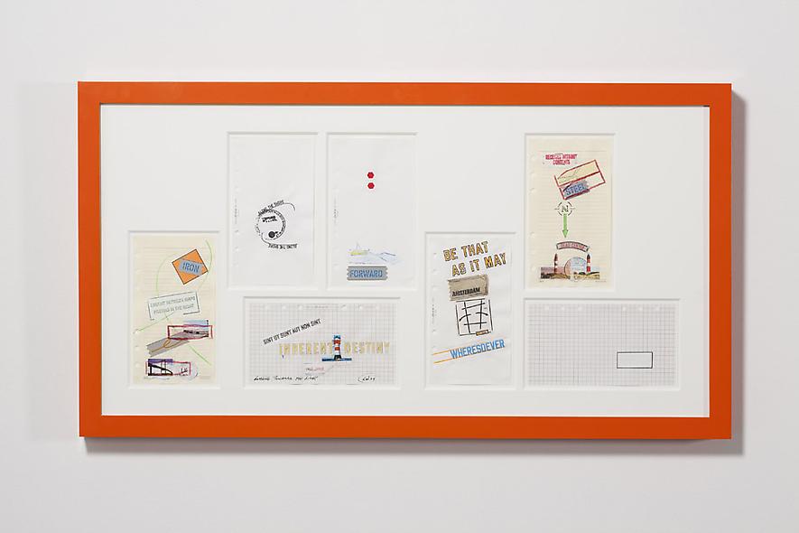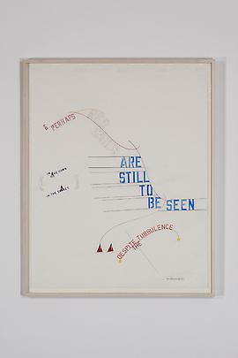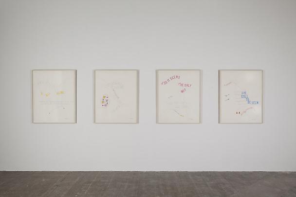 The drawings of the North Gallery Viewing Room incorporate more images than many of the artist’s larger works. While still making use of text, the smaller works draw attention to their various shapes and forms, as well as their combined impact as a whole. The viewing room also holds a cartoon DVD, similarly titled Gyroscopically Speaking.