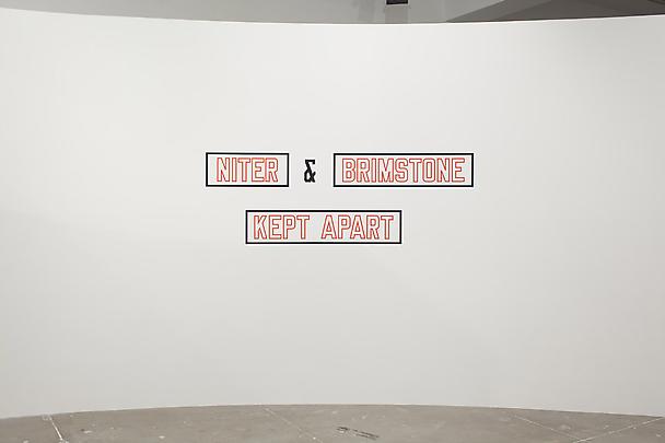 The North Gallery holds five works displayed on the specially constructed curving wall. Weiner’s text-based work plays on the ambiguity of language, open to translation and personal associations or connotations. The volume-less works lend themselves to a dynamic context, easily installable anywhere.