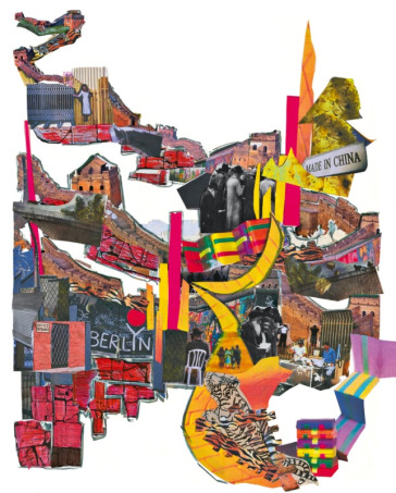 A video installation and a collection of collages on the walls augment the exhibition. Similar to the juxtaposition the mobile sculptures afford, the collages piece together familiar emblems and images of landmarks in a surprising and almost disconcerting way. In Walls, various representations of the Berlin Wall and the Great Wall of China crop up repeatedly, alongside the iconic yellow brick road in the center of the collage. Snow has a knack for bringing unexpected pieces together to make us see each in a new light.