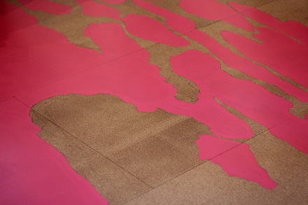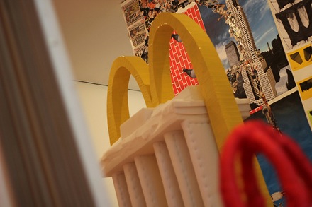 At the base of the exhibition is the map painted in pink on the floor. The sculptures are mixtures of various historical structures and trademarks, like the McDonald’s arches mingling with the pillars of the Parthenon. Snow mounted them on wheels as a way to invite viewers to move them around the distorted world map. Other mobile sculptures include a circle of photographs of historical sites that can be rotated and viewed from an opposing mirror, and broken cityscapes that see-saw back and forth. Breaking the tie between place and physical structures, Snow challenges the essence of these monuments’ source of importance and breaks down geographical barriers. The ease of mobility gives every person access to monuments that can otherwise feel imposing and distant in their true scales.
