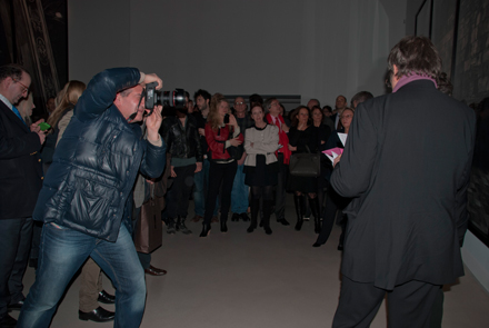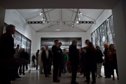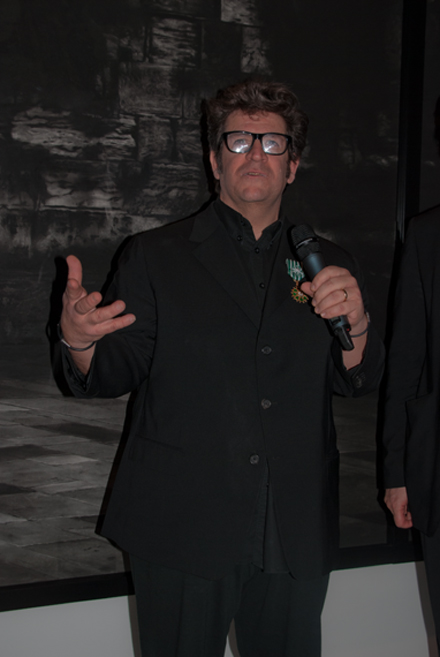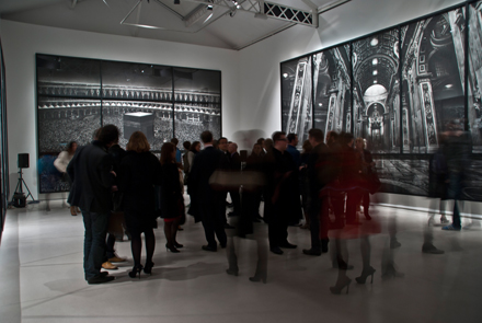 Art Observed was on-site for the opening of a solo-show by American Robert Longo entitled “God Machines.” A long-time collaborator of the gallery, this is Longo’s first major exhibition at the gallery in many years. The exhibit features three monumental works in the form of large-scale charcoal drawings which almost completely cover the walls of the main gallery space. The works are dedicated to three monotheistic religions and depict major places of religious worship. The event also celebrates the twentieth year anniversary of Galerie Thaddeus Ropac in Paris.