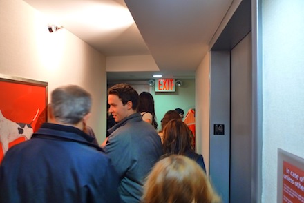 Crowds emerge from the elevator at the 14th floor galleries.