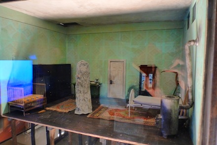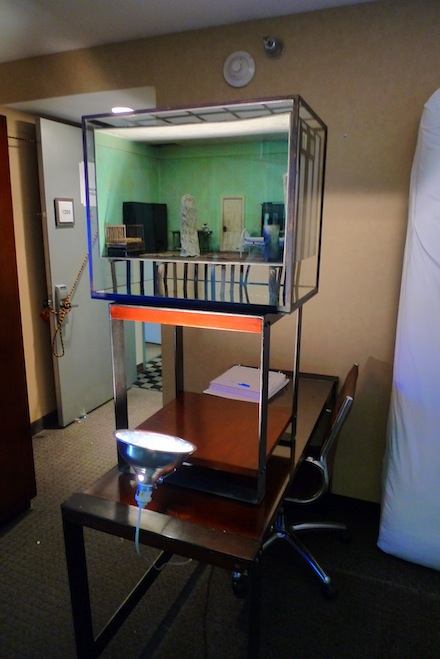 At Ramiken Crucible, artist Andra Ursata encased in glass a highly detailed diorama that sat on twig stilts. Elevated and lit from a single lamp below it, the scene was a miniature replica of her childhood home in Romania. The artist mulled her own memory to meticulously reconstruct her home and added a ghostlike presence to the center of the room.