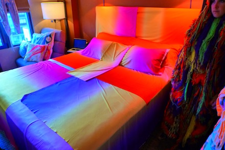 Polly Apfelbaum’s multicolor bedspread for Cleopatra’s.