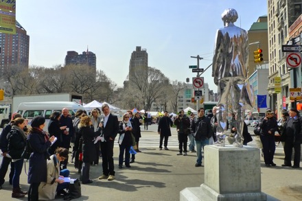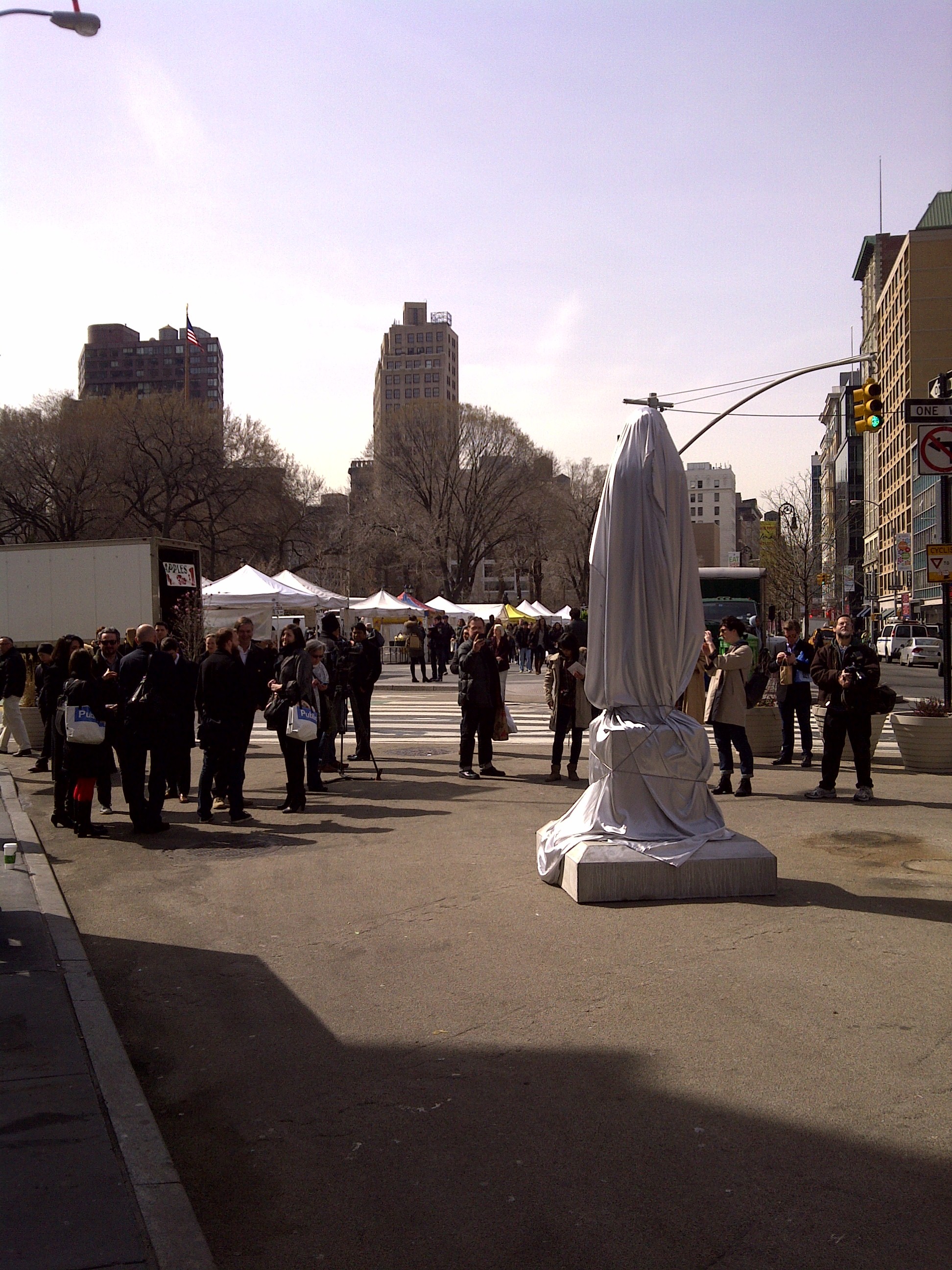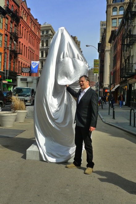 Rob Pruitt revealing his new public sculpture at 17th St. and Broadway.