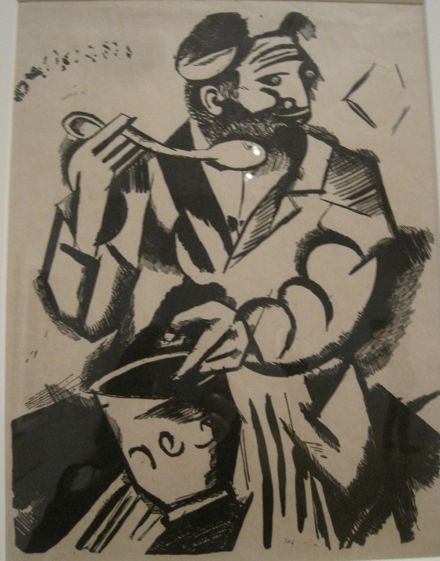 Some of the exhibition’s most arresting pieces are the ones that discuss Chagall’s Judaism, as it is in turn discussed by the politics that persecuted him and that pervade his pieces. “Oh God” (1919), above, reminiscent of Munch’s “The Scream” (1910), is both an epithet of and a cry for salvation, though God himself here may be just another perpetrator. This dichotomy appears again in “Purim” and “Man With Lulav” (both c. 1916-1917), which present classical Jewish images, in terms of — simultaneously — custom and stereotype. Taylor’s inclusion of “The Crucifixion” (1940), an interesting addition to a show containing mostly pieces completed between 1910 and 1920, further demonstrates the power that propaganda plays, and the sadness all throughout the exhibition.