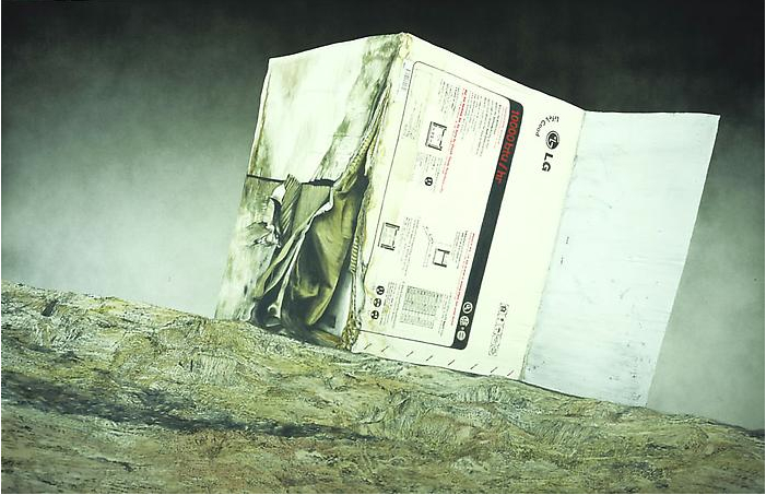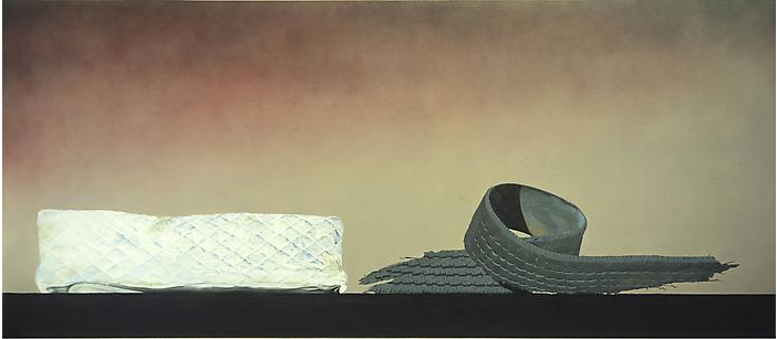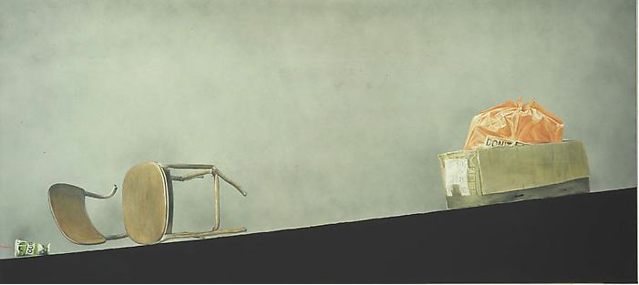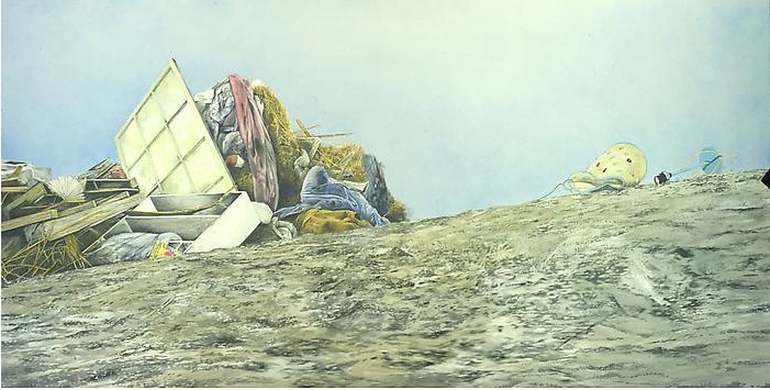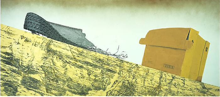 Words are noticeably absent in this series, except when they appear as brand names on a crumpled Bud Light box or a discarded mattress. The gallery describes the works as a “surreal extension” of the Course of Empire series that Ruscha produced for the 2005 Venice Biennial. That series was inspired by five paintings by Hudson River School painter Thomas Cole which depict the same landscape over time as it is transformed from pristine natural environment to bustling metropolis and finally to desolate ruins. The current series of paintings engages those same themes of waste and the passage of time—Ruscha actually found and took in many of the objects in the paintings while driving on the highway in California.