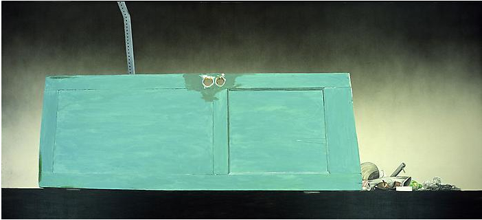 Together, the ten paintings at first seem to compose something akin to a 21st century vanitas. In place of skulls and dead flowers the Psycho Spaghetti Westerns have abandoned doors and trash heaps that encourage reflection on death—not so much of ourselves, though that is there too, but of objects in our consumer society. Ultimately, though, the paintings eschew morbidity and socio-political concerns about waste and instead envision a happy ending for these discarded items. In Ruscha’s world, garbage is resurrected as art.
