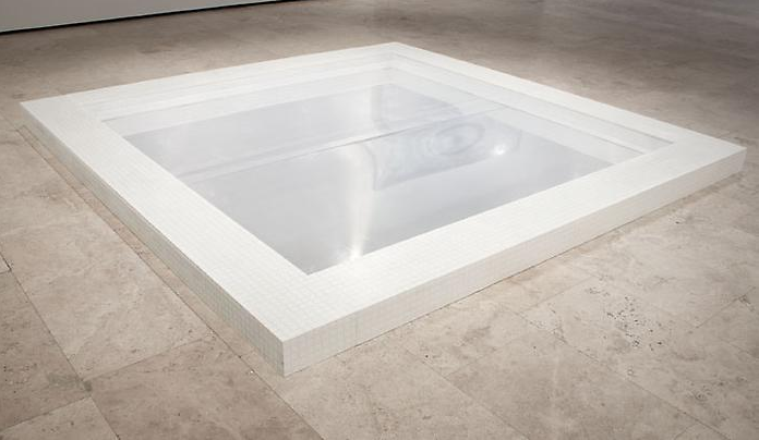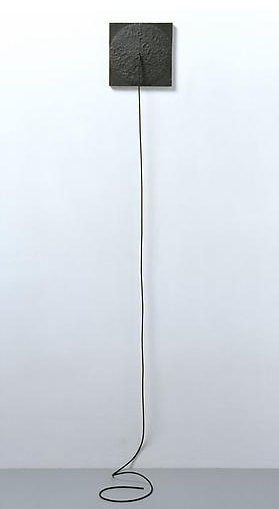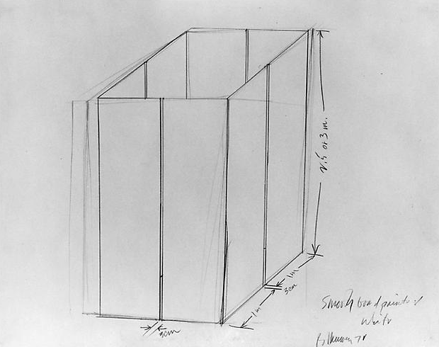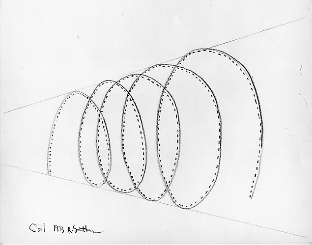 Bruce Nauman’s Parallax Shell (1971-200)  features a small enclosed room made of white walls with four vertical streams of light. Eva Hesse’s No Title (1966) is a simple black square panel on the wall with a long black cord coiling down to the floor. Robert Morris plays with our notion of perception; his pencil drawing Coil appears to be at once flat and also in perspective depending on which angle it is viewed from.