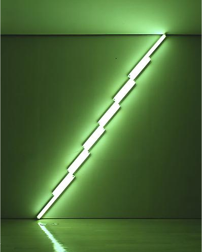 Gego’s square kinetic sculptures are constructed from narrow tubes and chains and seem almost to move before the viewer as they cast their shadows on the wall. A long green fluorescent light-bulb made by Dan Flavin from seven overlapping 4-foot bulbs stretches from ceiling to floor and remains peacefully static. Robert Morris’ large steel Observatory reveals strong circular forms split by a seeming horizontal rod.