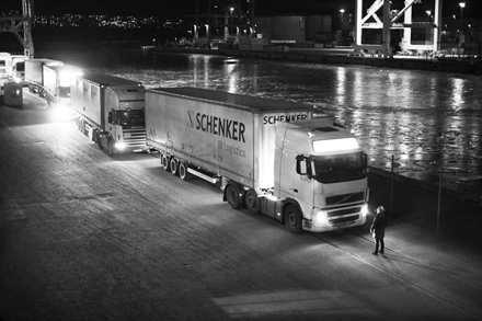 Santiago Sierra, Person Obstructing A Line of Containers, Kaj 3 Frihamnen Stockholm, Sweden, 2009. Video still.