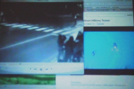 Encountering the installation, one must immediately come to terms with the fact that the viewer’s experience will never comprehend in entirety the specific moving images being projected on the walls, let alone their accompanying soundtracks. The three white walls of The Journal Gallery receive different film projections, each of which document an experience (presumably Ackermann’s) of intense video viewing and manipulation from a computer screen. The subjects presented range from speeches by Muammar Gaddafi and hazy helicopter footage, to Paul Virilio asserting Fascism is a result of “masked Futurism”, to various dance sequences including promotional video for Michael Jackson’s HIStory album, a highly choreographed Easter Sunday flashmob at Budapest’s Heroes’ Square, and Rebecca Black’s “Friday” music video. All of the accompanying sound is played simultaneously, and because each film is of different length, an audiovisual cacophony is produced that will never be heard repeated.