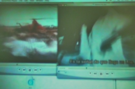 Standing in the center of The Journal’s space, the viewer must constantly make turns and dart his or her vision from one visual to another to gather information. This is not unlike the contemporary mode of news consumption, in which the television audience splits the focus between video and texual feeds crawling across various parts of the screen, or for a computer user switching through different windows and links, texts and video. The themes explored in Ackermann’s video choices address notions of politics and cultural tradition, temporality and orchestration. In numerous instances, the cursor is seen rewinding the videos and making them play forwards and back. The software interface (Mac OS X) is revealed throughout. While this saturation of moving image and accompanying video is indeed a violent, intentionally fragmented experience to endure, it is not without cohesion. Ackermann’s three presentations are related in such that when moving one’s attention from wall to wall, the viewer is asked to reconsider the presented images in ways that recast their seemingly disparate nature as in fact, interconnected.
