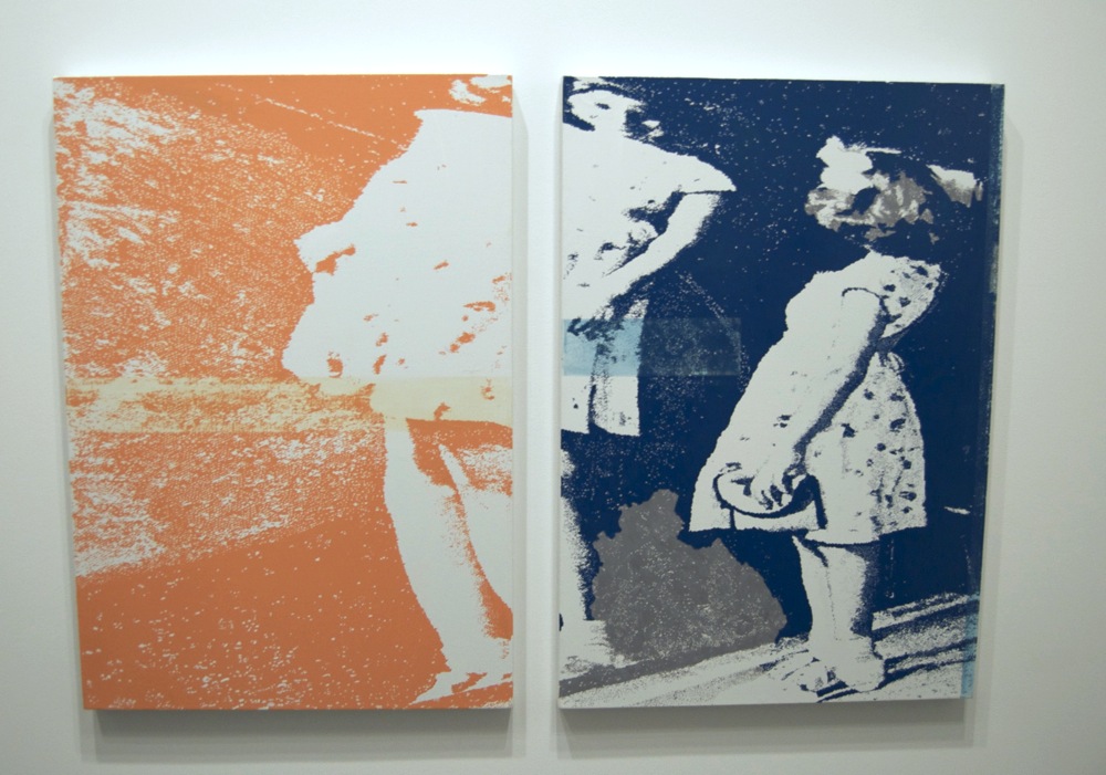 Both Big Girls/Little Girls and Porn Grids deal with issues of femininity and subjectivity. In the former, ben-day dot images on enamel compose a feminist homage to Warhol, questioning representations of beauty through the eyes of young girls who attempt to make themselves in the image of their idols. The works contrast prints of film starlets with those of young girls considering their own distorted reflections in funhouse mirrors, emphasizing the influence these images have had on today’s women. Conversely, in Porn Grids, the female (and occasionally male) subjects remain mostly faceless, in viscous paintings depicting stills of “money shots” from pornography. If Big Girls/Little Girls speak to Warhol, these paintings echo Pollock, but with white splatters a little more pointed in their referents.