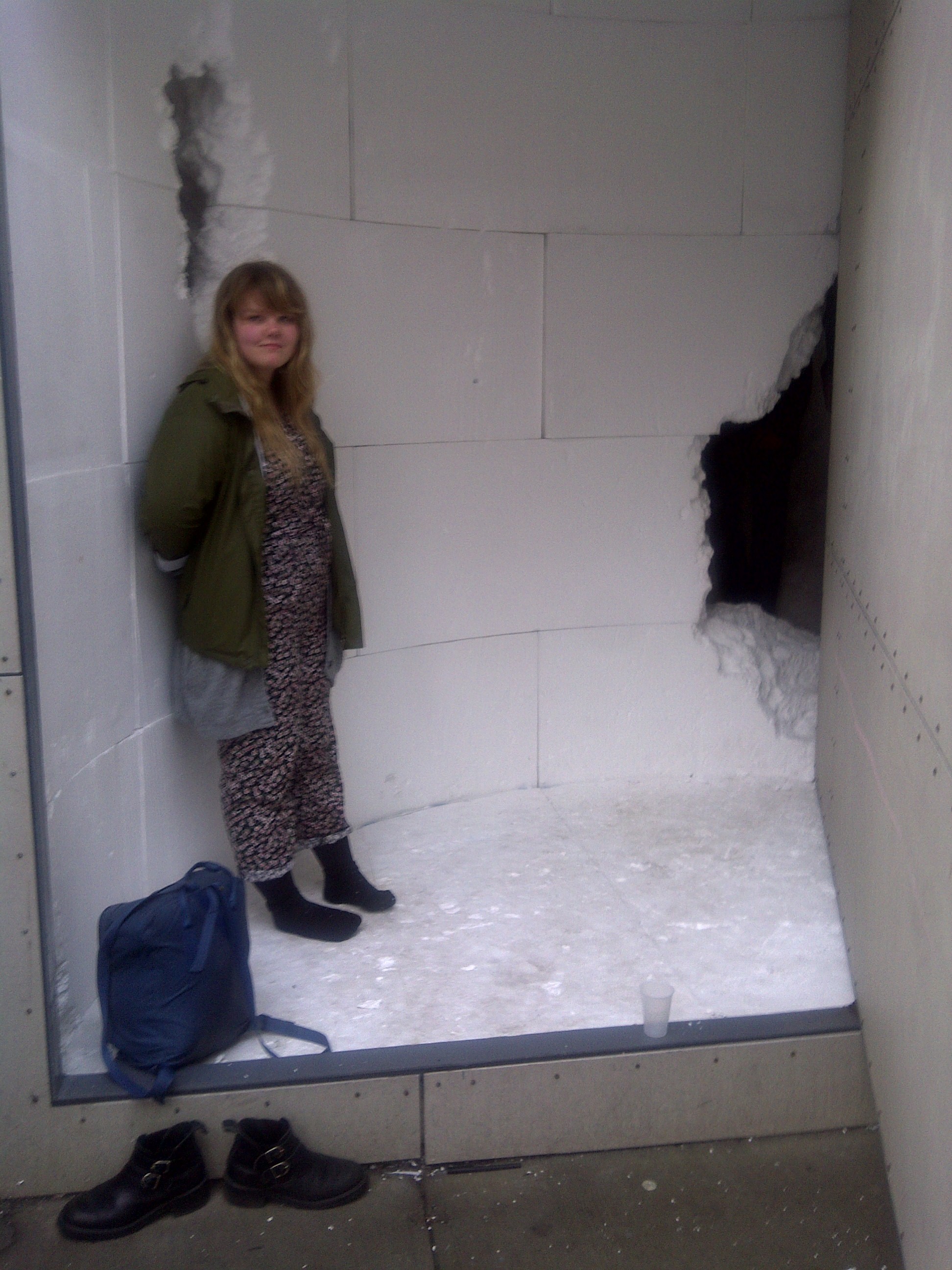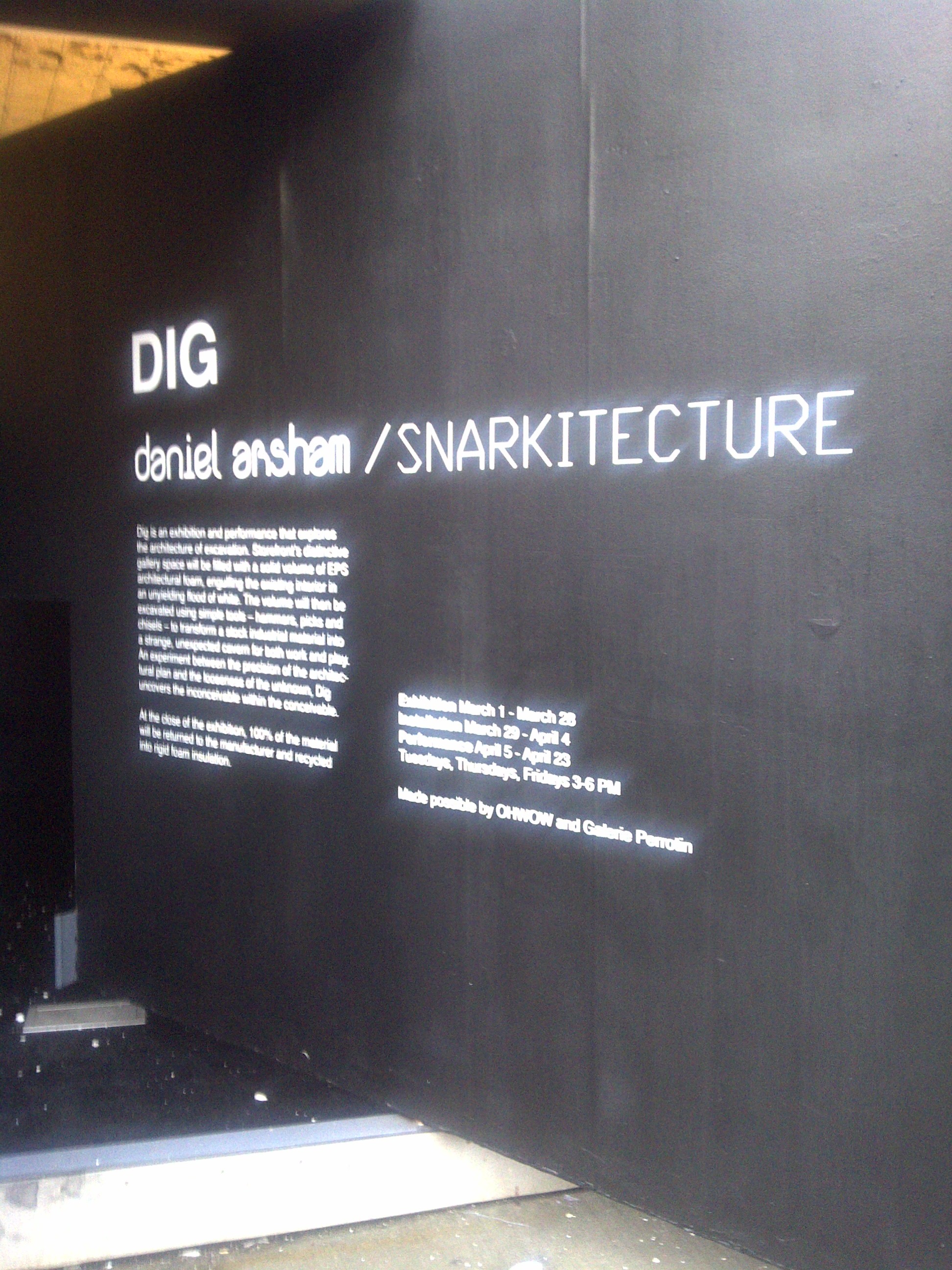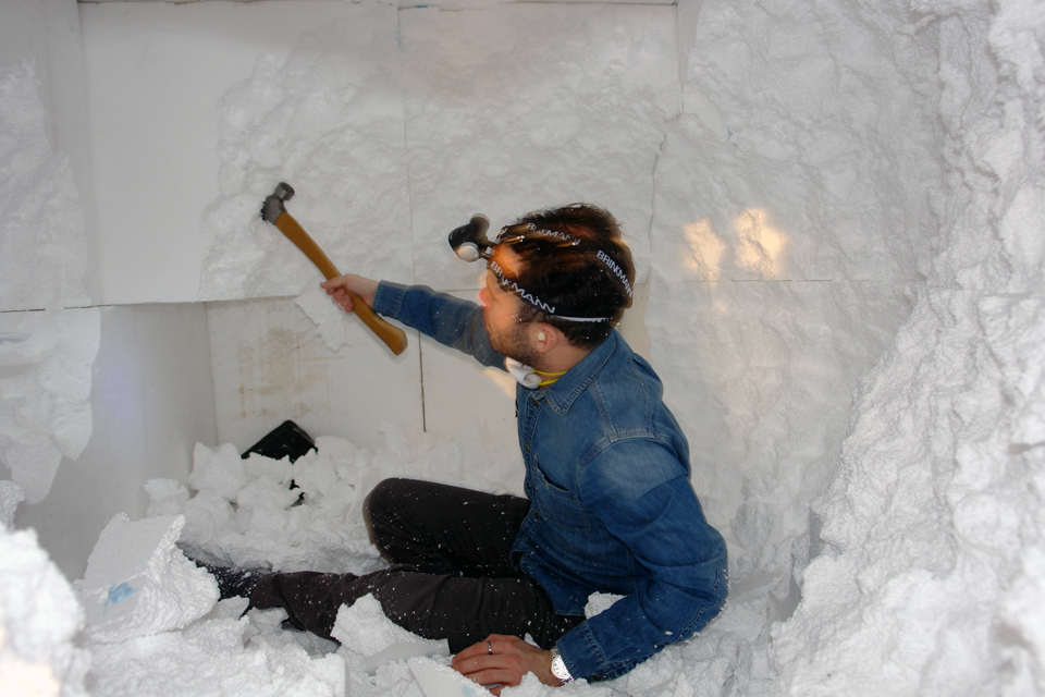 In an interview with AnOther magazine Daniel remarked on the inverse relationship between architecture and and the project: “DIG essentially fills the entire gallery of Storefront For Art and Architecture with a solid form. Architecture is usually made by creating surfaces and planes that confine a volume. So you build a house. You build four walls and a roof and a floor and that defines an interior space but it’s always a process of addition where you’re adding things to define space. DIG is the opposite. It begins as a solid and the act of excavation, the removal of the form, creates this space within that.” Arsham burrowed through the expanded polystyrene (EPS architectural foam) using only small tools – chisels, hammers and picks, giving the area a rough, cave-like feeling.