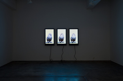 Three screens showing Robert Wilson’s Snow Owls Tryptic are installed in an adjacent gallery. Each screen shows an owl perched on a branch in front of a polka dot ground. The birds’ heads rotate to the tune of an operatic symphony as the creatures squawk. The gallery explains that Wilson’s work “re-imagines seriality and the grid for the digital age.”