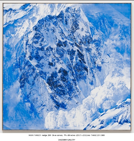 Within in the works on display, Tansey plays with ambiguity, inserting his own ideas into what appear to be well-known situations. The ultramarine color leads to comparisons to blueprints—guidelines for composition. The objects and locations within his paintings, such as a crowd of people or an icy mountain, are things we have seen before, but Tansey quietly distorts them. A second look at “Invisible Hand” shows a hand emerging from a snow bank, either sheltering the crowd or ushering them into the blizzard. The result is an experience of recognition and conflict—what is the event that is taking place?