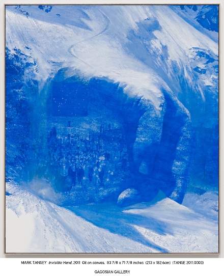 Painter Mark Tansey shows recent work at the Gagosian Gallery Beverly Hills through May 27th. Known for his monochromatic composite figurative paintings, Tansey has chosen works done in ultramarine to display in the gallery. His work is well known for crossing the boundaries of illustration and perception- works seem to depict single narratives or settings, but when given a second look, the figures begin to separate from one another and an assortment of new narratives form on the canvas.