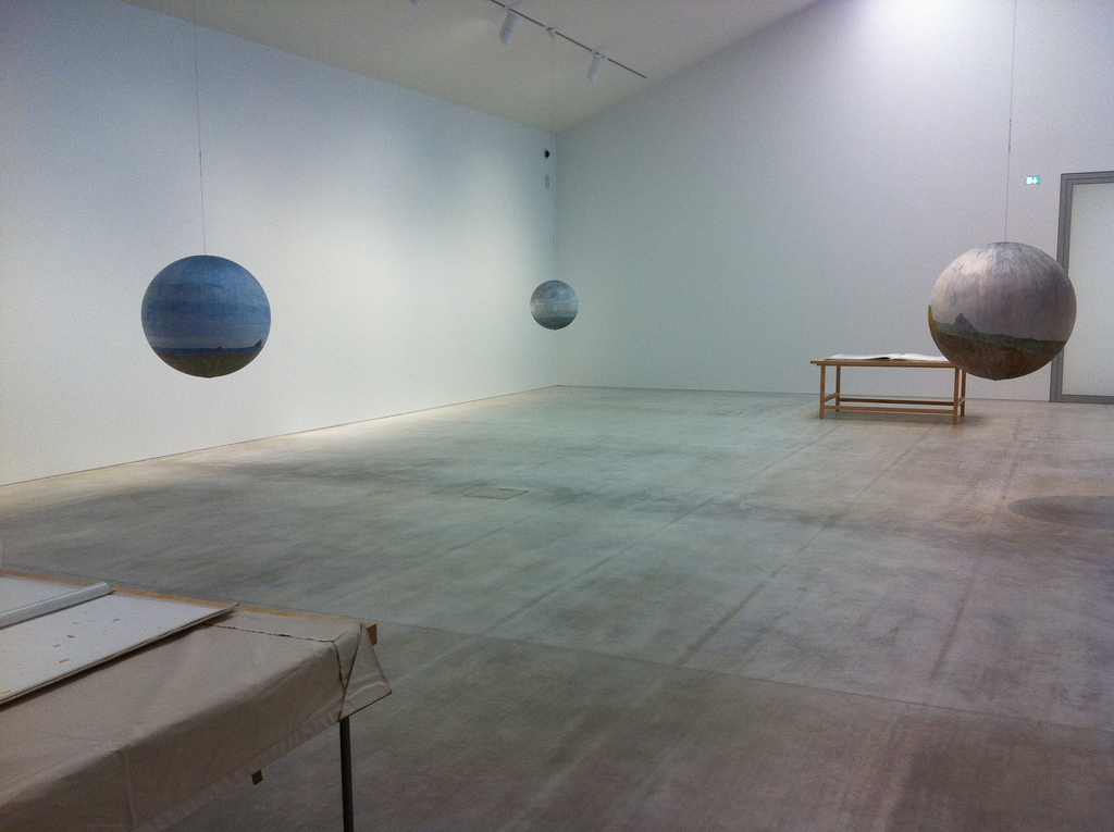 Russell Crotty’s installation reveals a series of suspended globes and small books which are covered with depictions of landscapes and seascapes as well as astronomical maps. Crotty draws his inspiration from his experiences as an amateur astronomer and lover of nature.