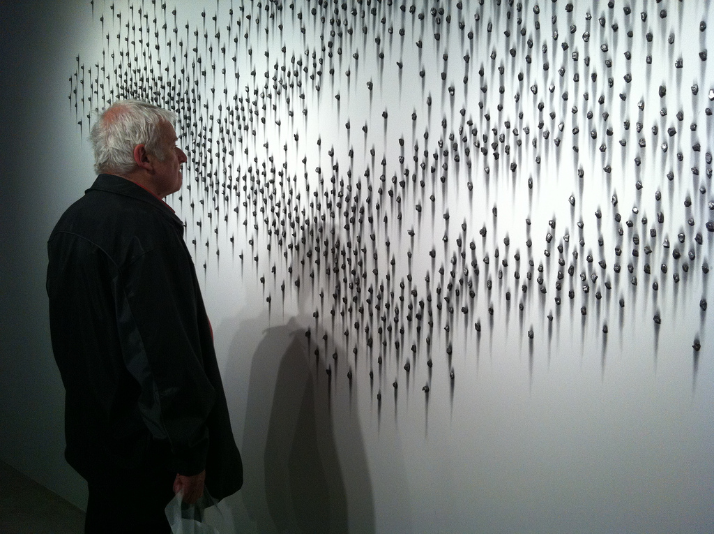 Teresita Fernandez has two works in the exhibiton: Sfumato (September 18) (2009), which incporates pieces of graphite and drawing on the wall to then portray a cloud of rising smoke and a floor piece entitled Eruption (2005) that represents a view from above of the opening of a volcano.