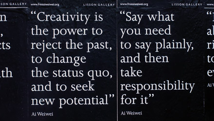 Installation of posters featuring quotes from Ai Weiwei’s blog