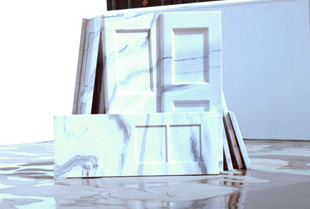 Outside, in the sculpture park, marble doors are piled up to mimic the junkyards found around in Beijing as a symptom of the city’s regeneration. The choice of material and its heavy entombment of the current and the ephemeral is consonant with the risk and rigor of Colored Vases (2010, 2009).